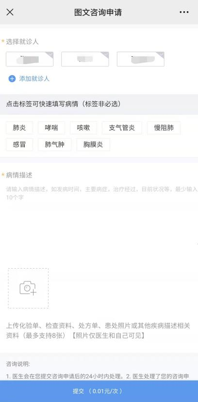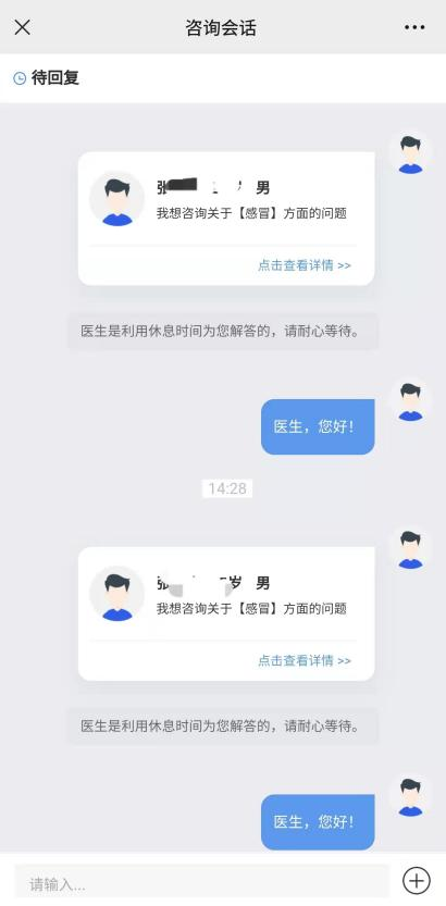 描述咨询内容,提交支付咨询费用,进入咨询会话界面等待医生回复。
