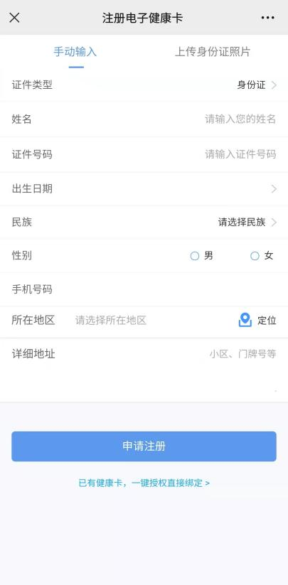 点击下方“就医服务”,进入医院主页,先“申请健康卡”填写个人信息,输入姓名、身份证号、手机号、家庭住址等信息完成申请注册。
