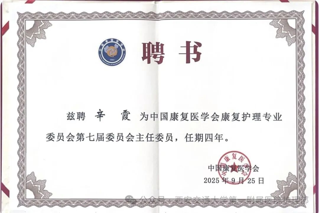 此次辛霞教授的当选,不仅是对其个人专业素养、学术成就及行业影响力的高度认可,也是中国康复医学会对该院康复护理工作整体实力与引领作用的重要肯定,标志着西安交大一附院在康复护理领域的长期积累与持续创新获得广泛认同。