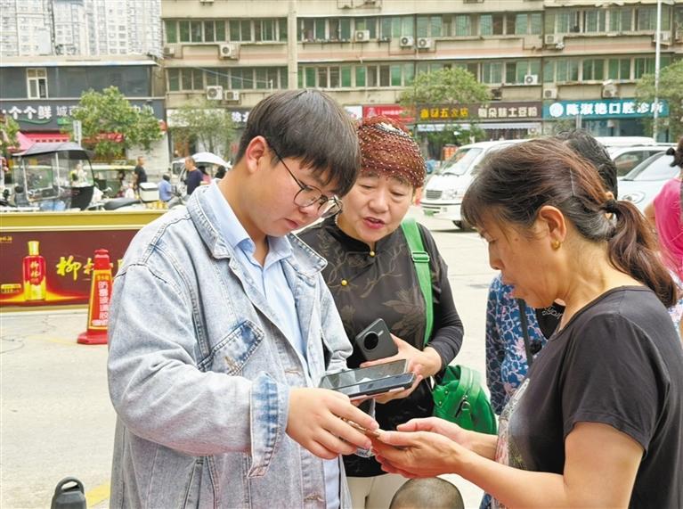 西安市莲湖区郭家口社区养老服务站开展为老年人配老花镜公益活动。图为工作人员为附近居民介绍如何进行扫码登记(资料照片)。 本报见习记者 马瑜摄