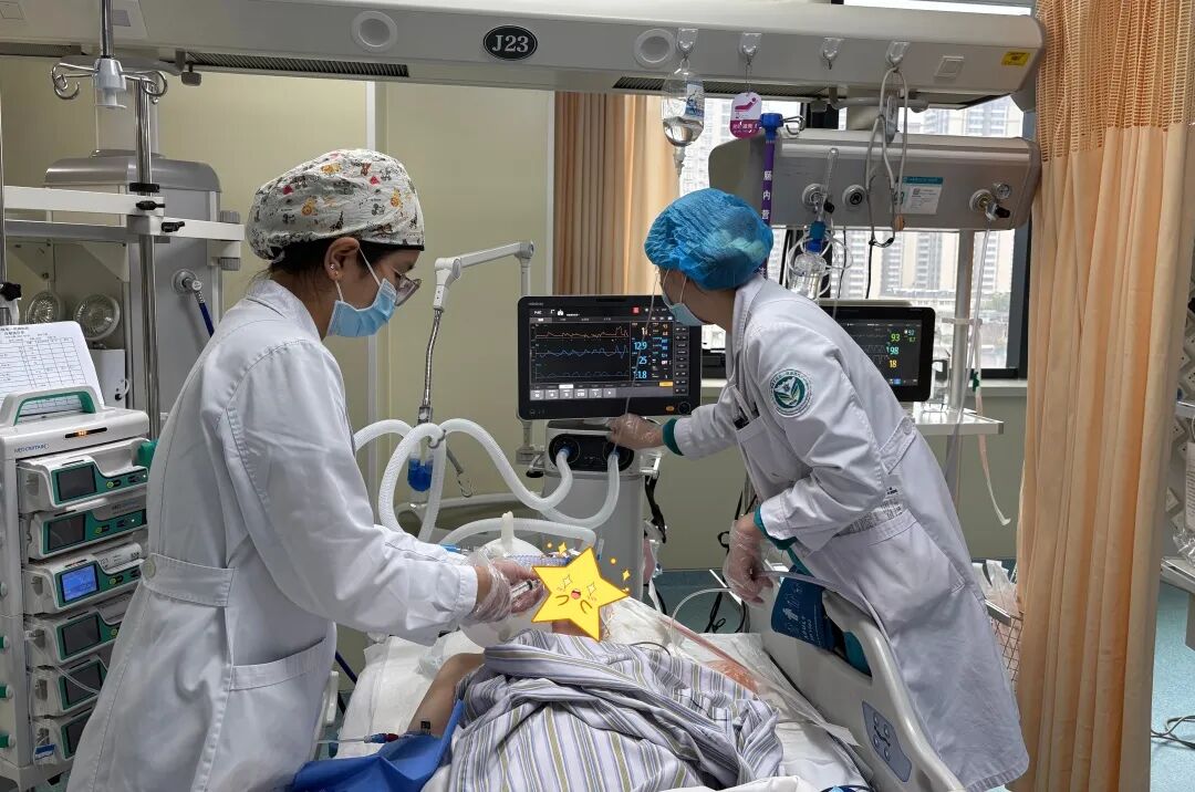 很快,骆大叔便在重症医学科接受了清醒状态下VV-ECMO支持。因其气喘难以平卧,ECMO团队在患者30°半卧位状态下为他快速完成右侧股静脉及右侧颈内静脉穿刺置管,不到20分钟时间便启动VV-ECMO治疗。随着ECMO转机成功,患者气短症状迅速得到缓解,生命体征趋于平稳。