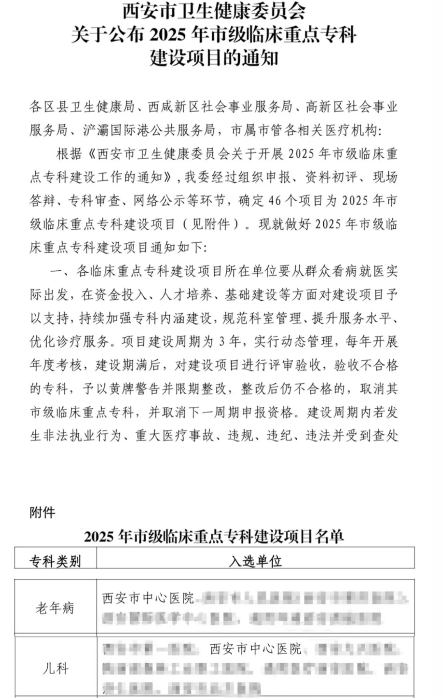 11月18日,西安市卫生健康委员会正式下发《关于公布2025年市级临床重点专科建设项目的通知》,西安市中心医院老年病科、儿科凭借卓越的专科实力成功入选。这一荣誉不仅是对两科室过往成绩的高度认可,更标志着该院在老年医学学科和儿科学学科建设方面迈上了新的台阶。