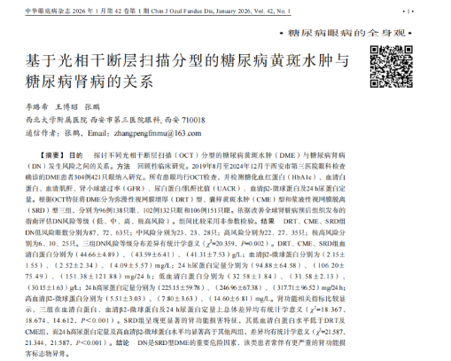 近日,西安市第三医院眼科在糖尿病视网膜病变研究领域再获进展——其最新研究成果《基于光相干断层扫描分型的糖尿病黄斑水肿与糖尿病肾病的关系》于2026年1月发表于国内权威眼科期刊《中华眼底病杂志》。该研究为糖尿病视网膜病变的精准诊疗提供了新思路,也体现了科室在该领域的临床与科研积累。