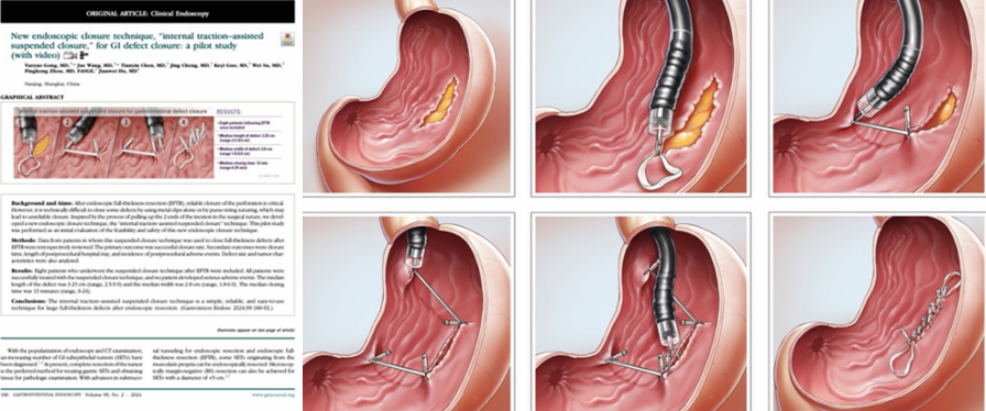 难题面前,消化内科王雨副主任医师团队带来了好消息。此前,王雨医生曾前往复旦大学中山医院内镜中心进修,师从国内知名内镜专家胡健卫教授,深入学习了胡教授发明的ITAS技术。回院后,团队结合临床实际需求,在原有技术基础上创新改进,在瘤体剥离同时进行牵引,边剥离边缝合创面,这种牵引缝合技术,专门破解EFTR手术缝合难、耗时长的问题。