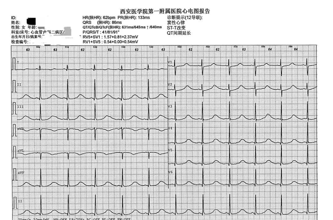 急诊医生第一时间为她做了心电图,结果显示:窦性心律、QT间期延长、ST-T改变,同时心肌损伤标志物肌红蛋白升高,血钾水平偏低。结合患者既往确诊的“先天性长QT间期综合征”病史,医生迅速判断,此次晕厥是恶性心律失常引发的。随后,急诊以“先天性心脏病、Q-T间期延长、低钾血症”将患者收入心血管内科二病区进一步治疗。