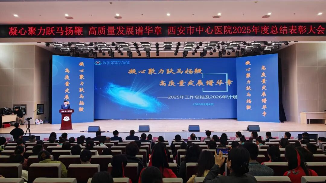 2月4日下午,西安市中心医院2025年度总结表彰大会在经开院区学术报告厅举行。会议全面回顾了过去一年医院高质量发展的奋斗历程,隆重表彰了为医院发展作出突出贡献的先进集体与个人,并对2026年工作进行了展望与部署。