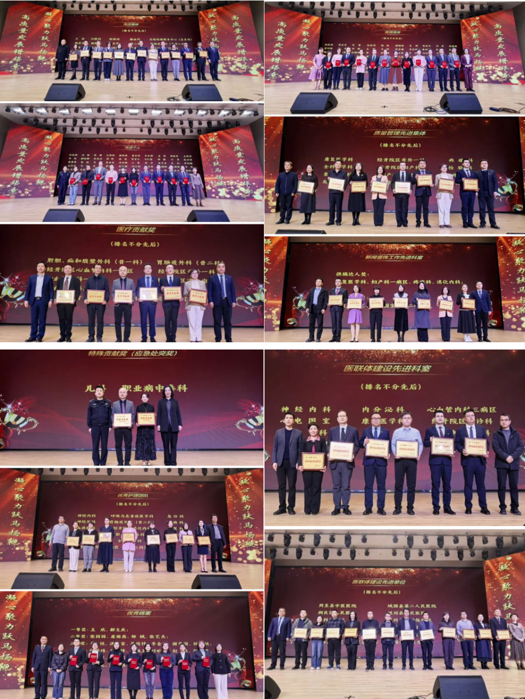 与会领导为获奖集体代表与个人颁发了荣誉证书与奖牌。台上,受表彰者们手捧证书,笑容灿烂;台下,掌声雷动,是对奋斗者最美的礼赞。一个个闪光的名字,一个个优秀的团队,是医院过去一年精彩答卷最生动的注脚,也激励着全体中心医院人向榜样看齐,砥砺前行。
