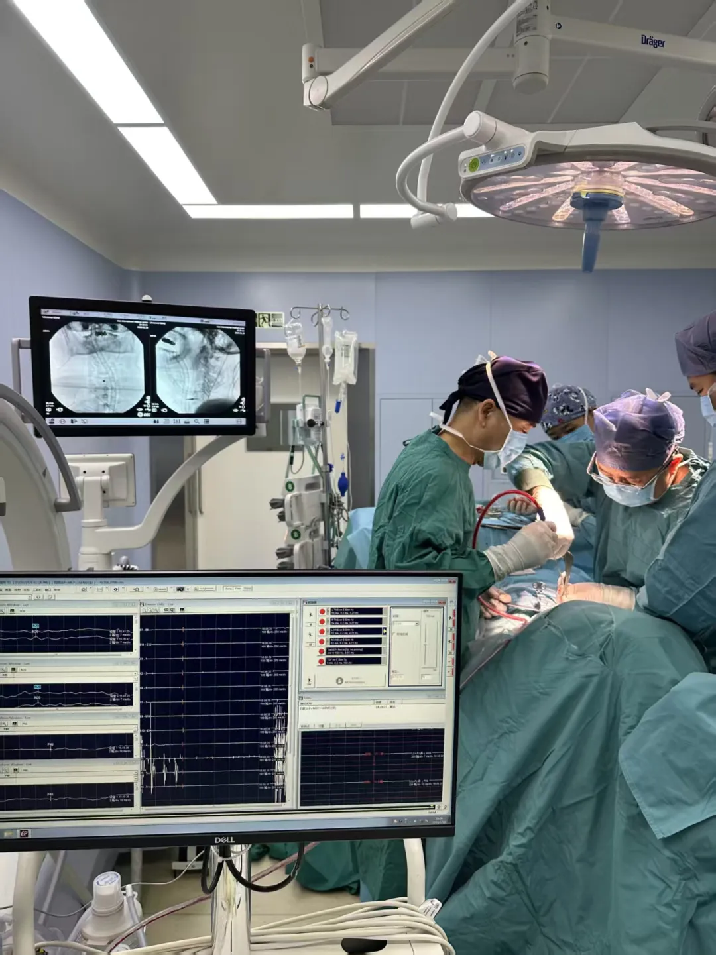 手术当天,在神经电生理监测的实时护航下,贺西京院长、臧全金主任主刀,王雄勋主任医师、彭瑞健医生等团队成员密切配合。如同在钢丝上跳舞一般:仔细的软组织及骨性结构剥离、保护好动脉血管、在畸形的骨骼上找到预定的固定角度、螺钉植入、寰枢关节复位、植骨融合、寰枕融合内固定术——长达2小时的攻坚战,每一步都在神经电生理监测的“注视”下稳步推进。在所有步骤完成后,手术团队紧绷的心才算松弛下来。