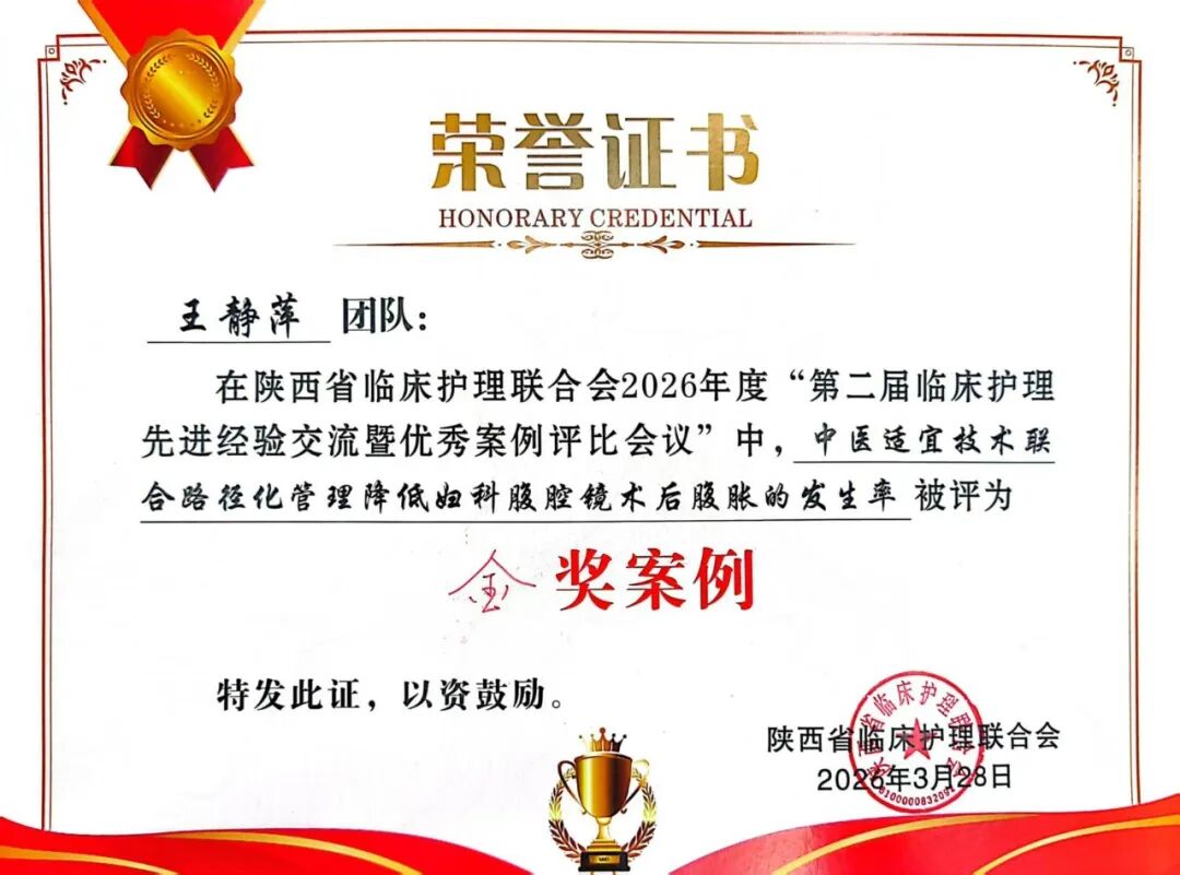 3月28日,由陕西省临床护理联合会主办的第二届临床护理先进经验交流暨优秀案例评比会议在西安落幕。本次比赛共吸引全省72家医疗机构、282项优秀案例报名参赛,涵盖三级医院、二级医院及基层医疗机构多个专场,竞争异常激烈。经过层层选拔,西安市第九医院妇产科护士长王静萍报送的《中医适宜技术联合路径化管理——降低妇科腹腔镜术后腹胀发生率》护理案例脱颖而出,荣获三级医院专场“金奖案例”!