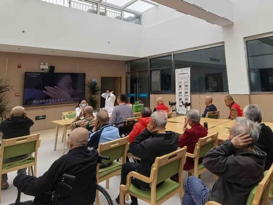 讲座的核心环节,当属中医《耳保健操》的现场教学。医生一边细致讲解每一式的动作要领,一边现场示范:“第一式——鸣天鼓,双手掌心捂住耳朵,食指轻敲中指轻叩后脑勺……”老人们跟着节奏认真学习,跟着示范抬手、按揉,现场气氛温馨又热烈。