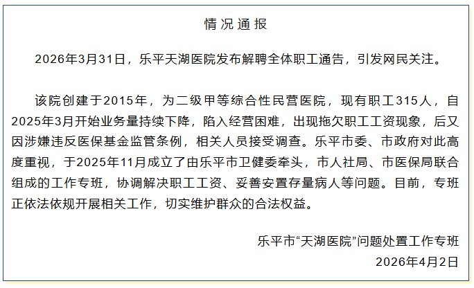 2026年3月31日,乐平天湖医院发布解聘全体职工通告,引发网民关注。