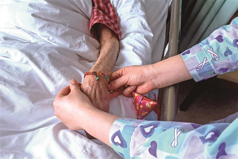 4月5日,西安工会医院安宁疗护病区,护士给患者戴上“幸运手环”。