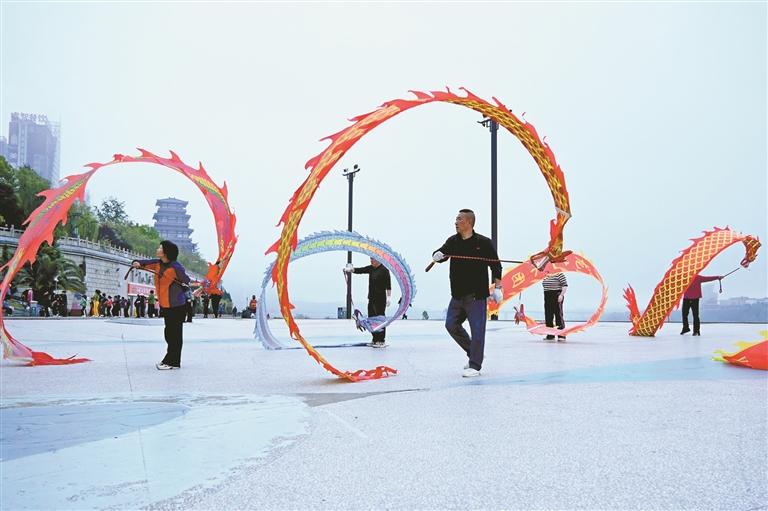 4月16日清晨,安康市汉江边滨江步道上,市民舞动彩带龙,乐享健身时光。