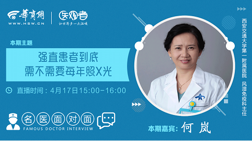 4月17日15:00-16:00,我们将邀请西安交通大学第一附属医院风湿免疫科主任何岚,走进华商网演播室,她将以“强直患者到底需不需要……